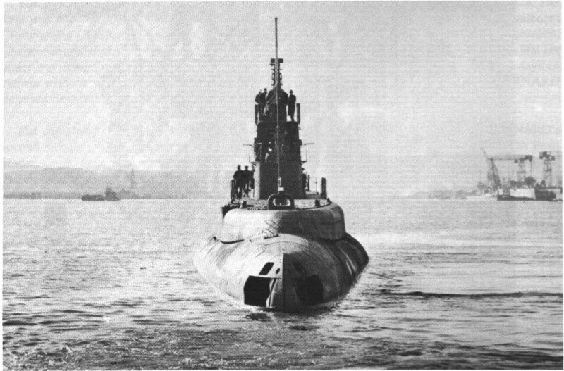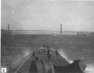 Picture of the Gurnard returning from her 4th War Patrol as she comes up to the Golden Gate Bridge.