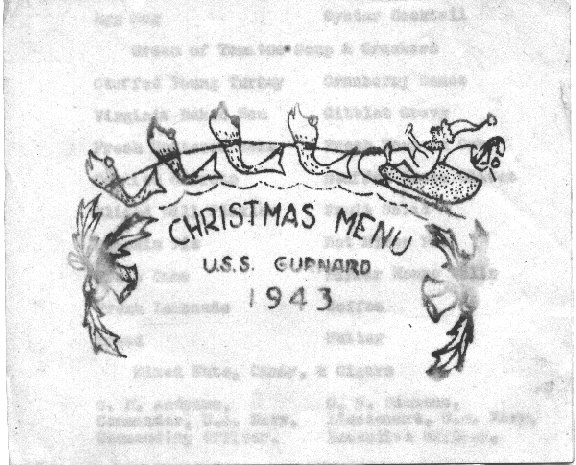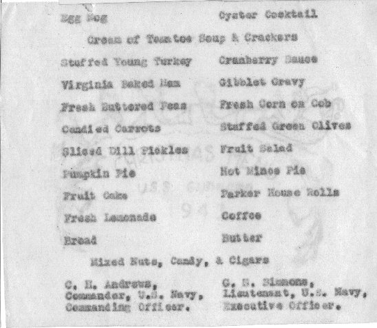Two pictures of the Christmas Dinner menu December 25,1943. Bill Burwell, Commissary Officer, didn't serve the egg nog until he was sure it was just right. He had to taste it a number of times before he was sure it was just right.