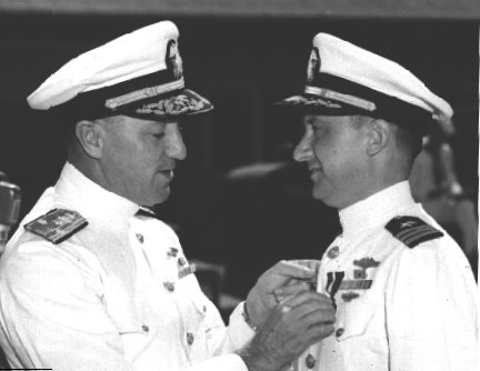 Picture of Lieutenant Commander Charles H. Andrews getting Navy Cross from Adm. Lockwood for 2nd run.