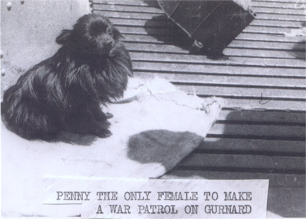 TME 2/C Glenn H. Milhorn remembers Penny the only female to make a war patrol on Gurnard. Penny was a great little dog. Bill Gleason and Bill Parks found her lost or abandoned in Perth. She was in pretty bad shape. The Pharmistist Mate doctored her up. She loved the crew and they loved her. She used to come leaping through the water tight doors into the after torpedo room. She would jump up on my lap and go to sleep. She had a good home but she did not like the depth charges. When we were under attack she weathered the storm under the pillow on Gleason's bunk.