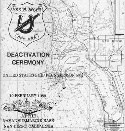 Plunger SSN-595 deactivation ceremony pamphlet cover. Over head picture of USS