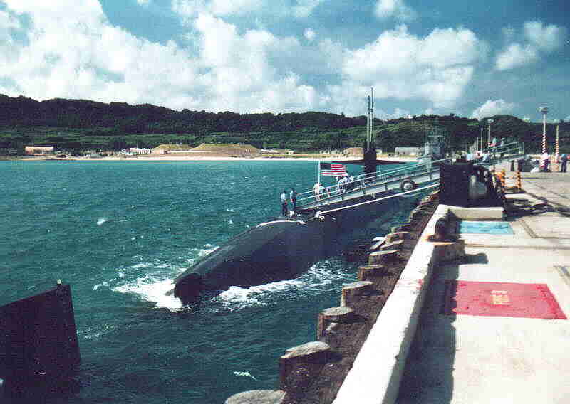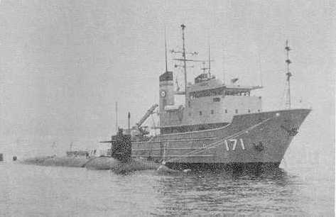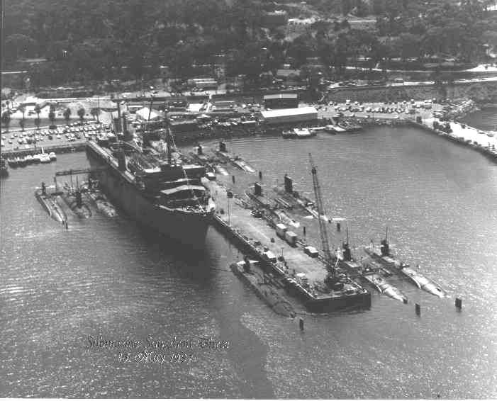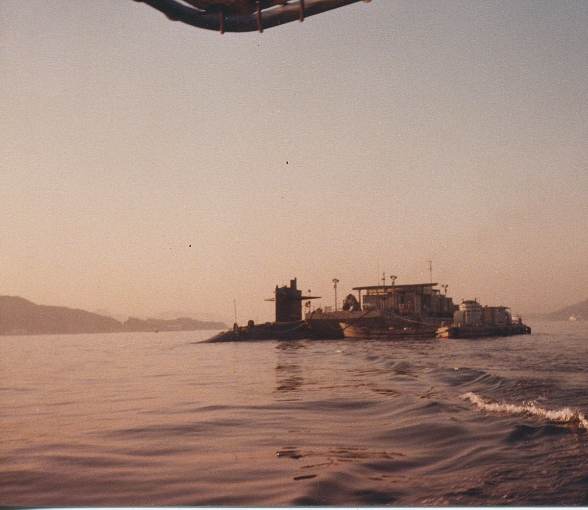 Sasebo, Japan, moored to the power barge, USS Plunger's final deployment to the Western