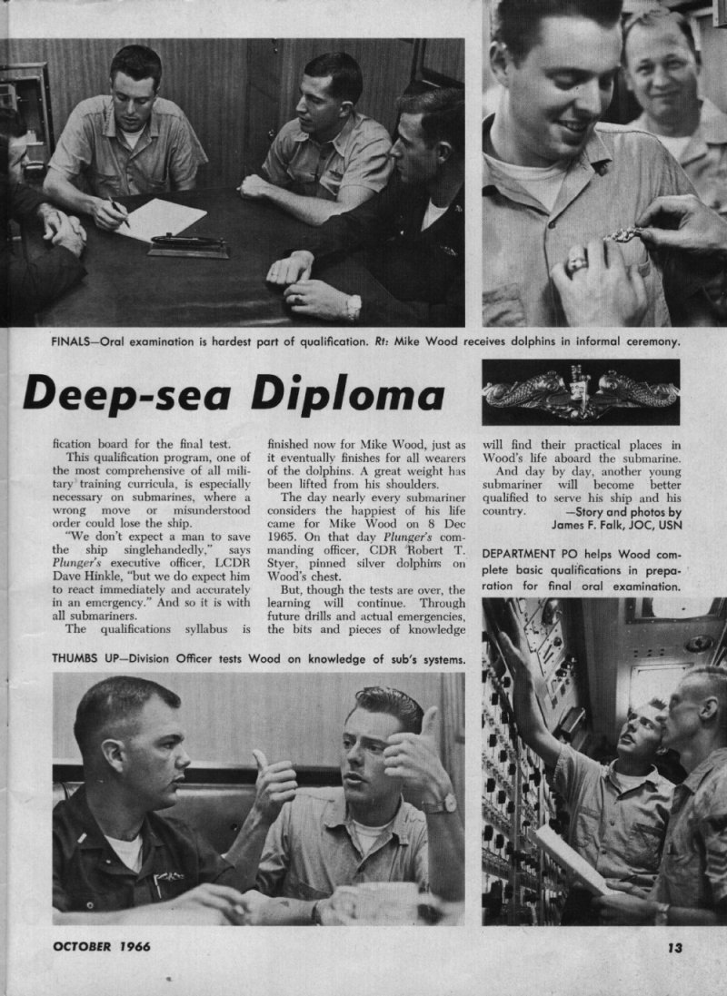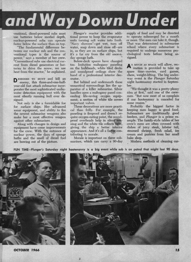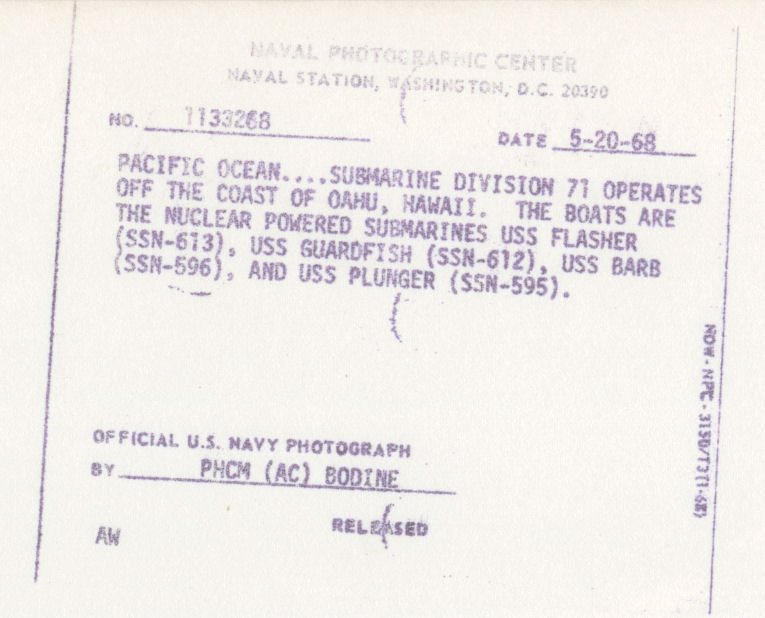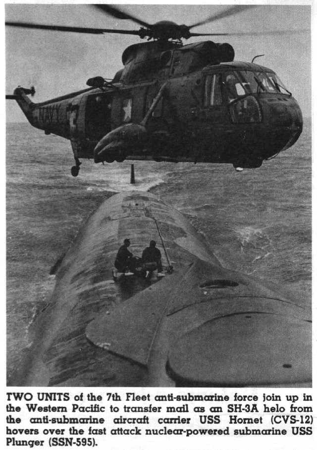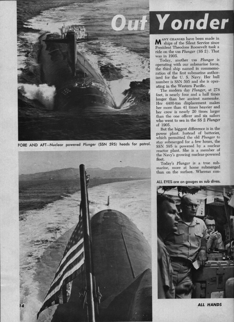 The Plunger was featured in All Hands magazine in October 1966. The following pages are scanned images of the feature stories about Plunger and her crew. The images are large so they can easily be read and they are filled with pictures of the crew from 1966.Cover, Page 1, Page 2, Page 3, Page 4, Page 5. In the September 1967 issue of ALL HANDS Magazine a Subroc is moved for loading aboard the USS Plunger (SSN 595). This rare photo was taken off Hawaii in early 1968. It shows Submarine Division 71 operating off Oahu. The boats are the USS Flasher SSN-613, USS Guardfish SSN-612, USS Barb SSN-596 and the USS Plunger SSN-595 steaming in formation. This is the back of the photo. Plunger on WESTPAC in 1969 made front page news due to protests when she arrived in Yokosuka, Japan.